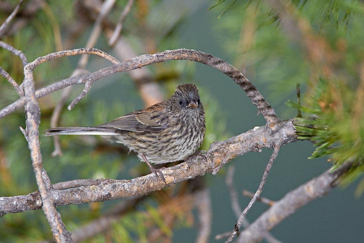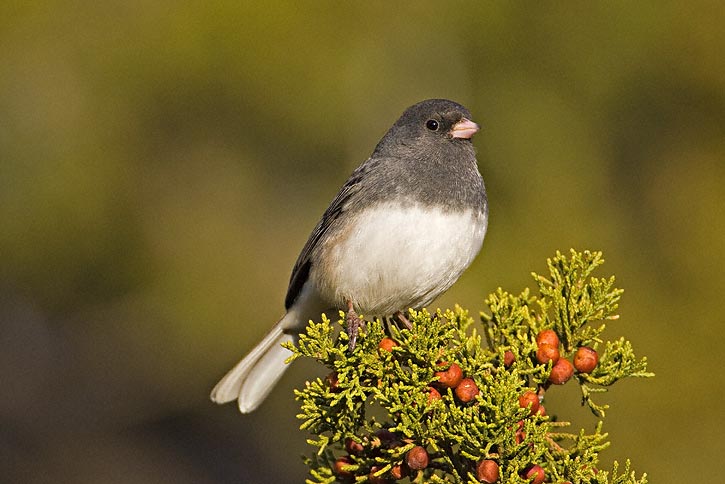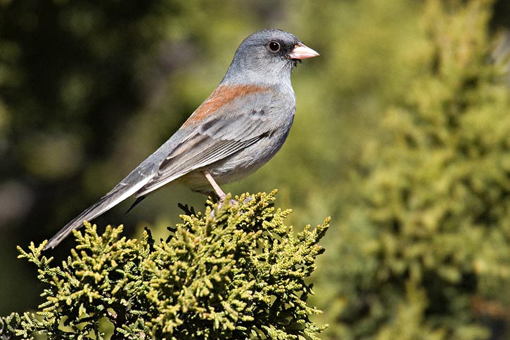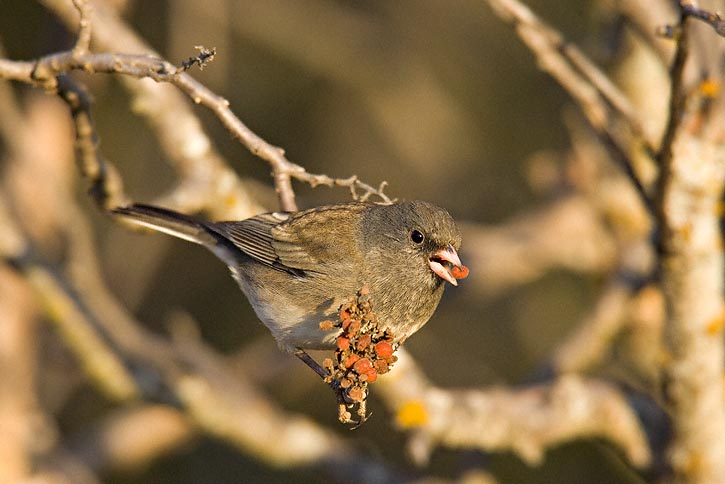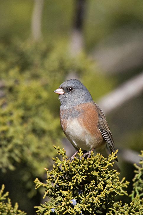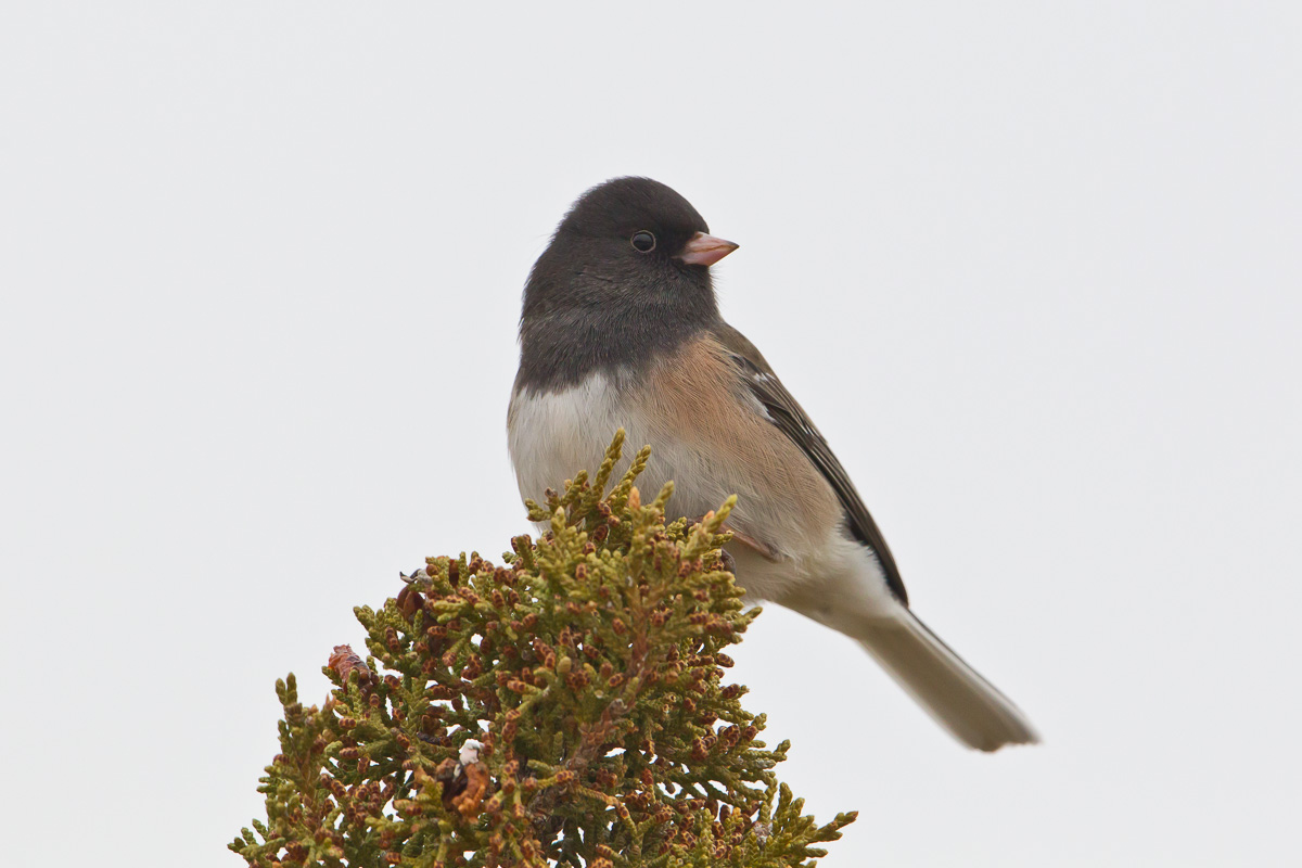 | Dark-eyed Junco (Junco hyemalis) is an extremely variable species which occurs across all of the U.S. and Canada. There are a number of "forms" or subspecies, most of which may be distinguished in the field. Some individuals, however, seem to be a combination of several of these forms and an accurate identification beyond species level is a challenge. Dark-eyed Juncos breed across much of Canada, the New England area, and the western United States and winter across the remainder of the country. The birds in the next 4 images were near the town of Lincoln, Lincoln Co., New Mexico, in November, 2005. The images were shot with a Canon EOS 1D Mark II and EF 500mm F/4 L IS lens and 2X extender. The first 3 shots show "Oregon/Pink-sided Juncos". | ![]() |