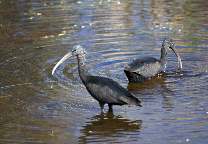 | The Glossy Ibis (Plegadis falcinellus) is a world-wide species which is locally distributed in many areas. It occurs in the extreme eastern United States with a few wandering west to Texas in some seasons. There have been a number of papers written in recent years about separating the species from the similar White-faced Ibis (P. chihi) since in all but high breeding plumage they can be difficult to tell apart. The reader is referred to many such published accounts if interested. The breeding plumaged adult Glossy Ibis shown here was at Anahuac N.W.R., Chambers Co., Texas, in April, 1996, and was photographed with a Canon T-90 and Sigma 500mm F/4.5 lens and 1.4X extender on Fuji Sensia. The immature Glossy Ibises in the next shot were photographed in March, 1997, at the Kennedy Space Center, Brevard Co., Florida, with a canon T-90 and FD 400mm F/5.6 lens on Fuji Sensia. | ![]() |