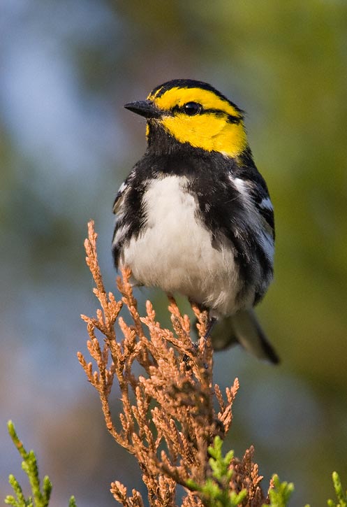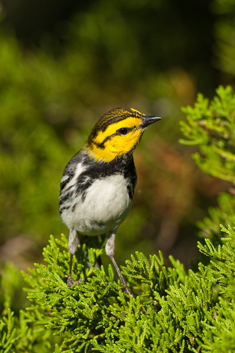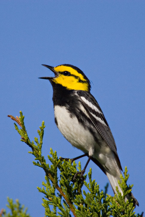 | The next five images shown here show a male Golden-cheeked Warbler and were taken in Travis Co., Texas, in April, 2007, with a Canon EOS 1D Mark II and EF 600mm F/4 L IS lens and 2X extender. This bird is not quite a full adult judging from the olive coloration on the back. | ![]() |