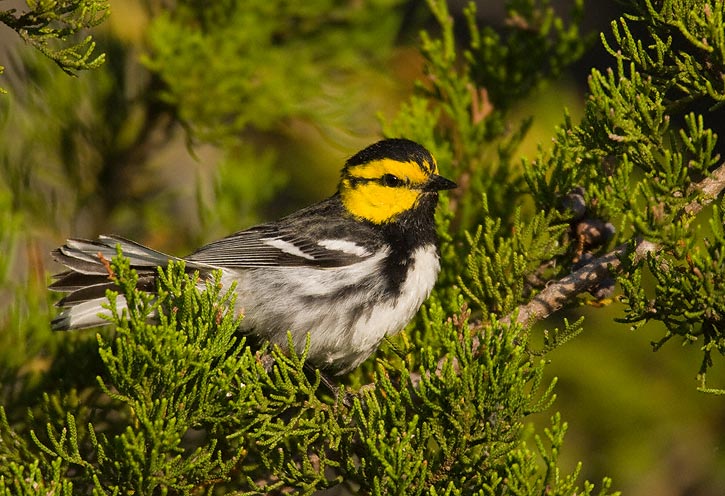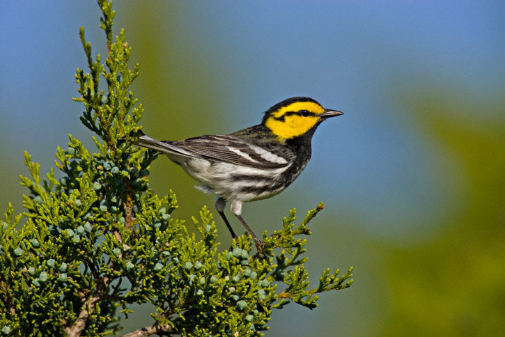 | This nice adult male Golden-cheeked Warbler posed nicely in an Ashe Juniper tree, while the female below kept watch. | ![]() |