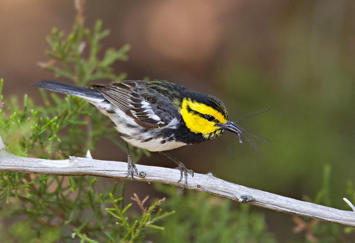 | The female Golden-cheeked Warbler shown here was in Bandera Co., Texas, in April, 2007. She flew off with this insect, presumably on her way to feed young. | ![]() |
