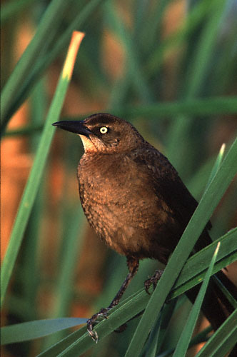 | The Great-tailed Grackle (Quiscalus mexicanus) is not typically thought of as a photographic subject, but occasionally one will present a nice composition. While sitting in a float tube blind waiting to photograph a Least Bittern on a Kenedy Co., Texas ranch, this female Great-tailed Grackle paused in the cattails as she approached her nest. I was able to get several photos in the warm evening light. This particular photo won 1st place in the oriole and blackbird division of the Valley Land Fund 2000 Wildlife Photo Contest. The shot was taken in June, 2000 with a Canon EOS 1N & EF 300mm F2.8L lens with a 2X extender from a float tube blind on Fuji Velvia pushed one stop. | ![]() |