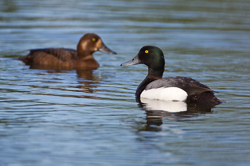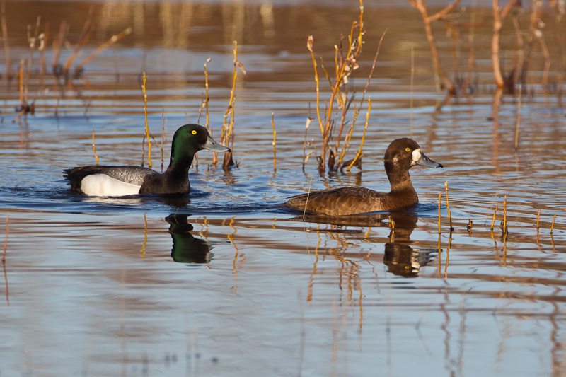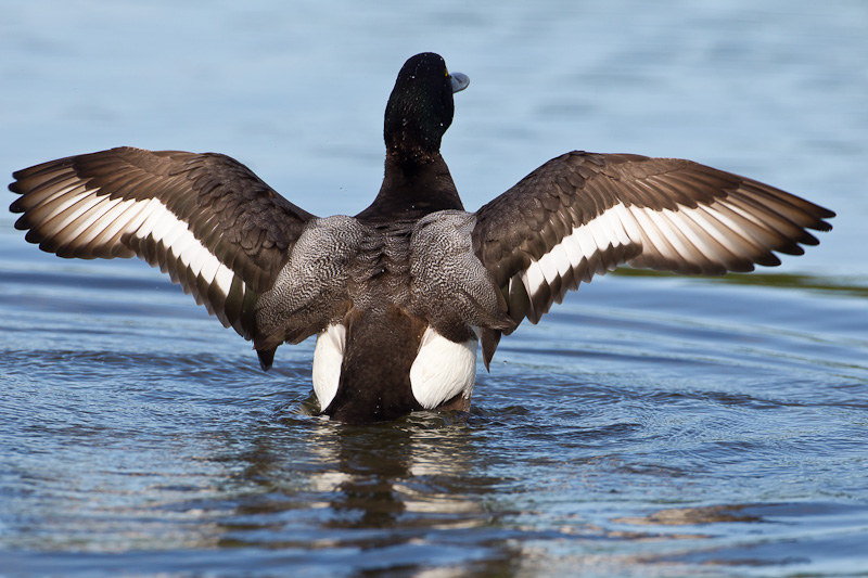 | The Greater Scaup (Aythya marila) is a diving duck which nests across northern Canada and Alaska, In winter it may be found along both the Atlantic and Pacific coasts of the United States as well as many inland locations south through Texas. It is similar to its close relative, the Lesser Scaup, but typically has a larger bill, a more rounded greenish tinted head and bright white sides. The white wing stripe of this species, visible in flight, is also quite distinct from Lesser Scaup. The first two shots on this page show a pair of Greater Scaup at Nome, Alaska, in May, 2012. These shots were taken with a Canon EOS 1D Mark IV and an EF 500mm F/4 L IS lens and 1.4X extender. |