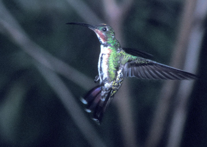 | The Green-breasted Mango (Anthracothorax prevostii) occurs throughout a large area of the lowlands of Mexico and Central America. In January, 1992, an immature or female Green-breasted Mango showed up at a feeder in Corpus Christi, Nueces Co., Texas. This record established the first for The United States. The two shots here are images of that first U.S. record. Since that time, about a dozen additional records of this species have been accepted for Texas. The photos shown here were "record shots" taken under difficult circumstances through a plate glass window, so the photo quality is not what I would have preferred, but they served to document the occurrence. These images were shot with a Canon T90 body and a ED Canon 400mm F/4.5 lens with a flash on 400 speed film. | ![]() |