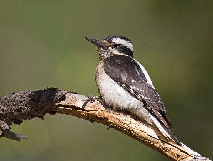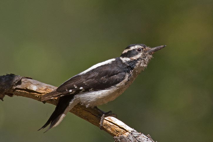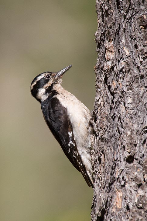 | The Hairy Woodpeckers of the southwest U.S. are a little duskier below and not as clean white as their eastern counterparts. They also show a reduced amount of white spotting in the shoulder area. The female in the next 3 shots was on Mt. Lemon, Tucson, Pima Co., Arizona, in May, 2008. These shots were taken with a Canon EOS 1D Mark III and EF 600mm F/4 L IS lens and 1.4X extender. |