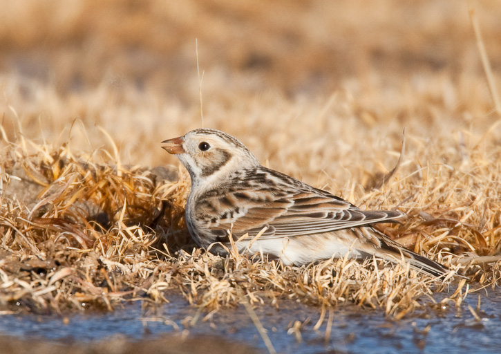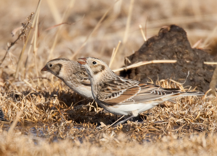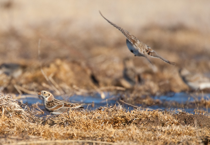 | The Lapland Longspur (Calcarius lapponicus) nests in Arctic tundra but winters over much of the United States. The winter plumaged Lapland Longspurs in the top 3 images on this page were landing briefly near a wet area to drink, near Texline, Dallam Co., Texas, in January, 2009. These images were taken with a Canon EOS 1D Mark III and EF 800mm F/5.6 L IS lens and 1.4X extender. | ![]() |