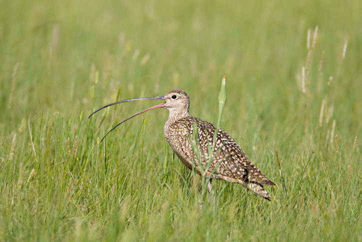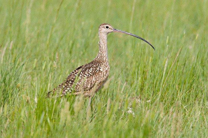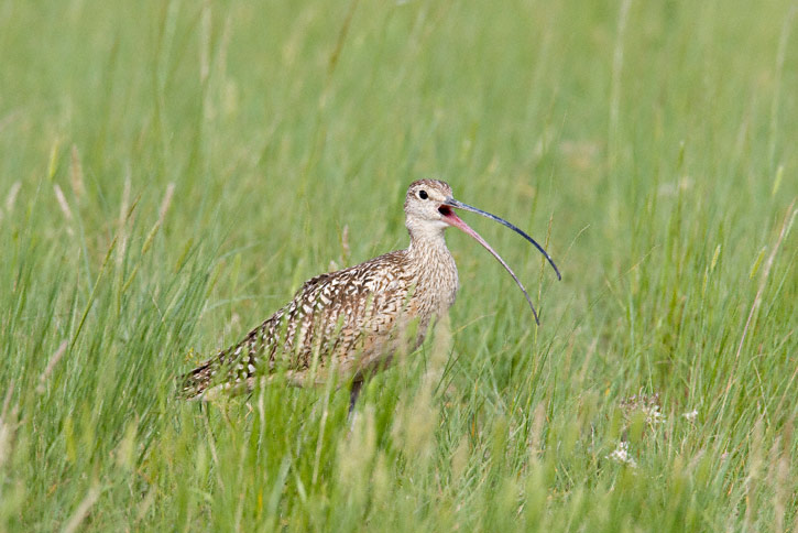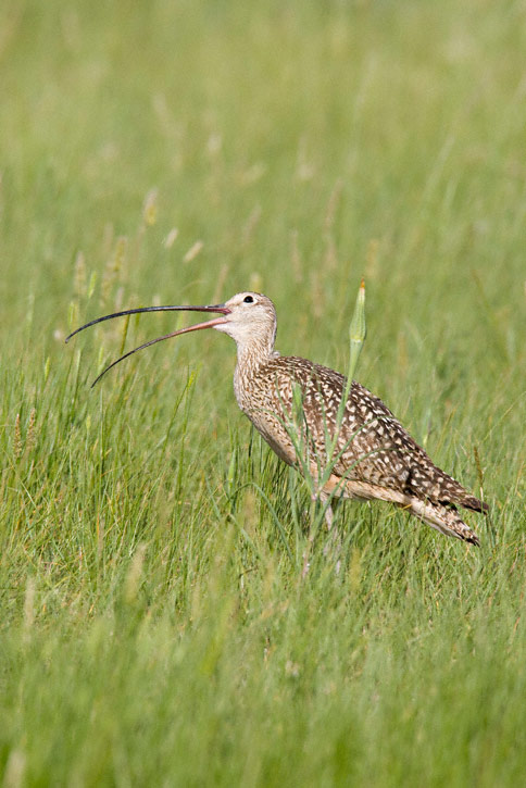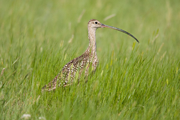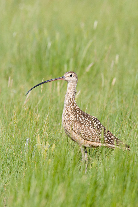 | The Long-billed Curlew (Numenius americanus) is a nesting bird of the grassland prairies of much of the central and north central United States and southern Canada. The species winters on all of our coastlines as well as the coasts of Mexico and southward. The first 9 shots on this page show Long-billed Curlews in their breeding habitat at Benton Lake N.W.R., Cascade Co., Montana, in June, 2007. These images were taken with a Canon EOS 1D Mark III and an EF 600mm F/4 L IS lens, sometimes with a 1.4X extender. | ![]() |