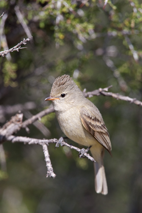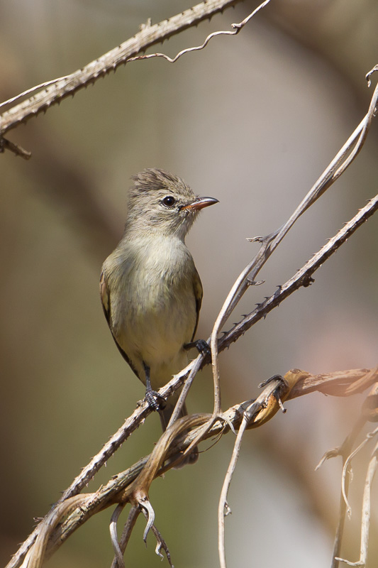 | The Northern Beardless-Tyrannulet (Camptostoma imberbe) occurs in the United States in deep south Texas as well parts of southwest New Mexico and southeast Arizona. It is widespread in Mexico. It is generally regarded as the smallest flycatcher in the U.S. and at only a little over 4 inches in length, it is indeed tiny. It is known for flycatching within the interior of a bush or shrub. The first 5 images on this page were taken in Catalina, Pima Co., Arizona, in March, 2009, with a Canon EOS 1D Mark III and EF 800mm F/5.6 L IS lens and 1.4X extender. For many years this species was called Northern Beardless-Flycatcher. | ![]() |