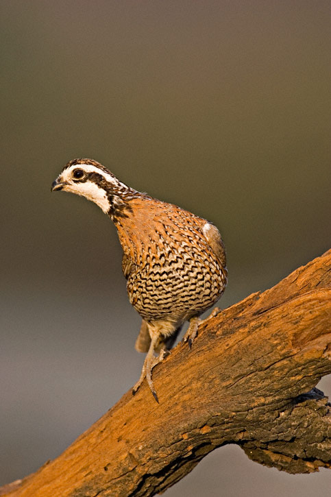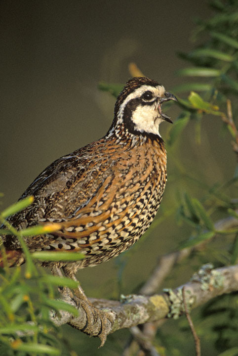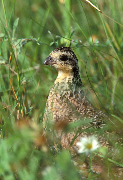 | The Northern Bobwhite (Colinus virginianus) is a resident bird of the eastern half of the U.S. and parts of Mexico. The male quail shown here is singing its characteristic "bob white" vocalization from a mesquite tree, while the female is moving through deep grass near a nest. These shots were in Kenedy Co., Texas, the female in 2000 and the male in 2002. The shot in 2000 was taken with Canon EOS 3 and a 600mm F/4 L IS lens and 1.4X extender on Fuji Velvia, while the shots in 2002 were taken with a Canon EOS 1V and the same lens and film. Below the top three film shots will be some more recent digital images. | ![]() |