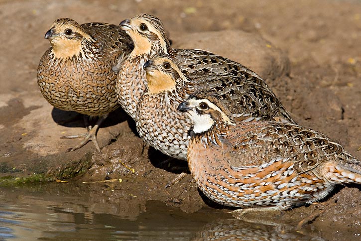 | The six Bobwhites above came to the edge of a small pond to drink in April, 2006, in Hidalgo Co., Texas. This shot, and the next eight below were taken with a Canon EOS 1D Mark II and an EF 500 mm F/4 L IS lens or a600 mm F/4 L IS lens. The shot above and the eight below were all taken during spring or early summer, 2006. | ![]() |