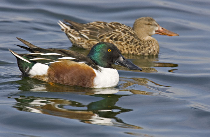 | The next 2 shots of male and female Northern Shoveler show the birds in a characteristic method of foraging whereby the bird swims through the water using its bill to strain food particles from the water's surface. | ![]() |