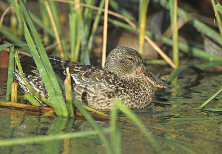 | The three shots shown here show female Northern Shovelers at Port Aransas, Nueces Co., Texas in February, 2001. These shots were taken with a Canon EOS 3 and EF 500mm F/4 L IS lens on Fuji Provia film. | ![]() |