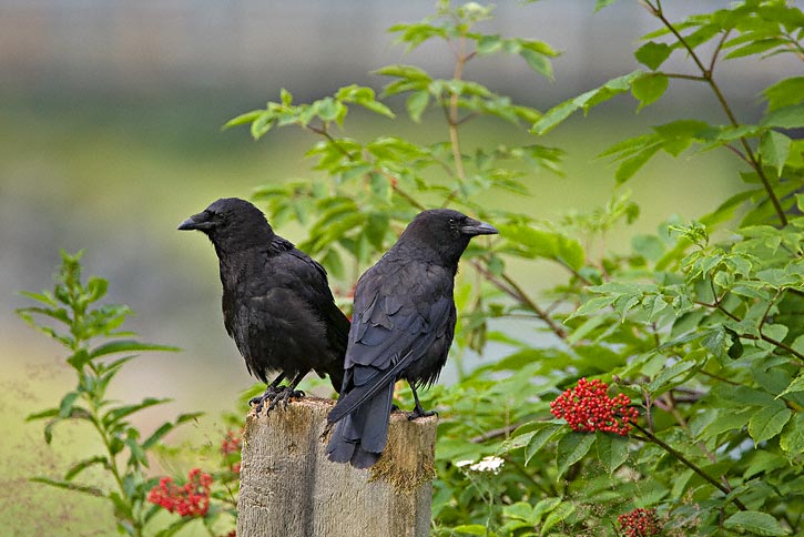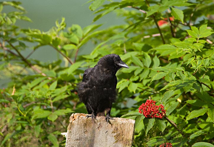 | The Northwestern Crow (Corvus caurinus) is very similar to American Crow but averages a little smaller and has a different voice. The first 6 shots on this page show a couple of Northwestern Crows at Haines, Alaska, in August, 2008. These shots were taken with a Canon EOS 1D Mark III and EF 500mm F/4 L IS lens. | ![]() |