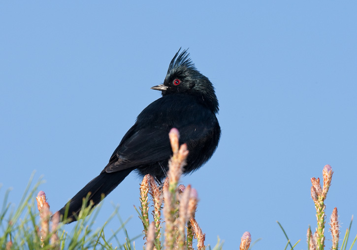 | The male Phainopepla in the next 2 shots was perched atop a small pine tree in Catalina, Pima Co., Arizona, in March, 2009. These images were taken with a Canon EOS 1D Mark III and an 800mm F/5.6 L IS lens. |