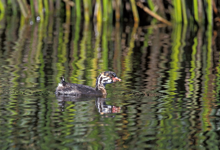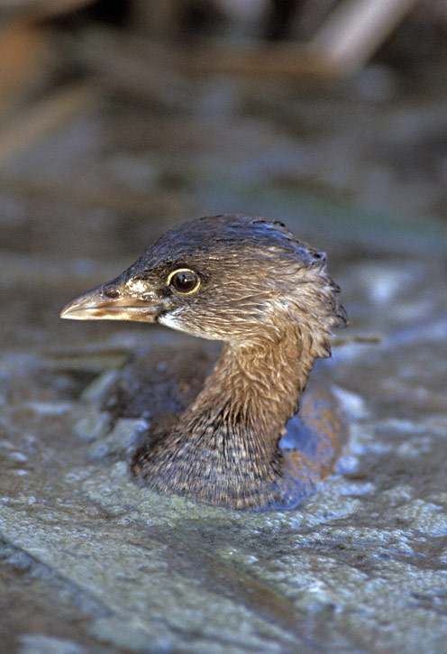 | The next two shots shown here show a juvenile Pied-billed Grebe not long after hatching. These shots were taken at Medicine Lake N.W.R., Sheridan Co., Montana, in August, 1999,with the same equipment and film as the shots above. | ![]() |