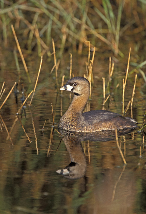 | The two shots shown here show a basic plumaged Pied-billed Grebe in Lee Co., Florida in November, 2006. These two shots were digital captures with a Canon EOS 1D Mark II and EF 500mm F/4 L IS lens and 2X extender. | ![]() |
