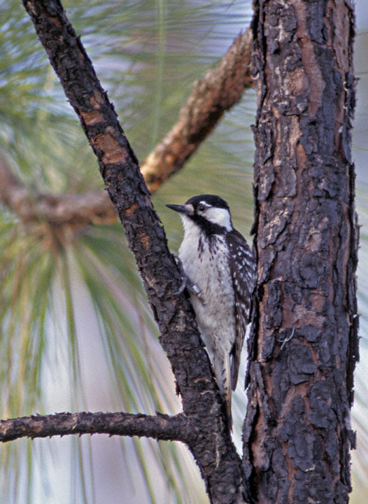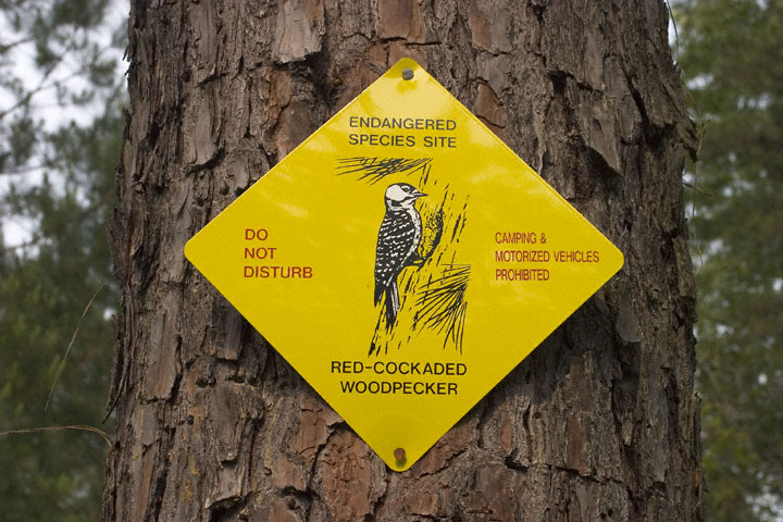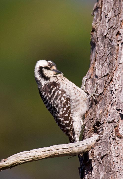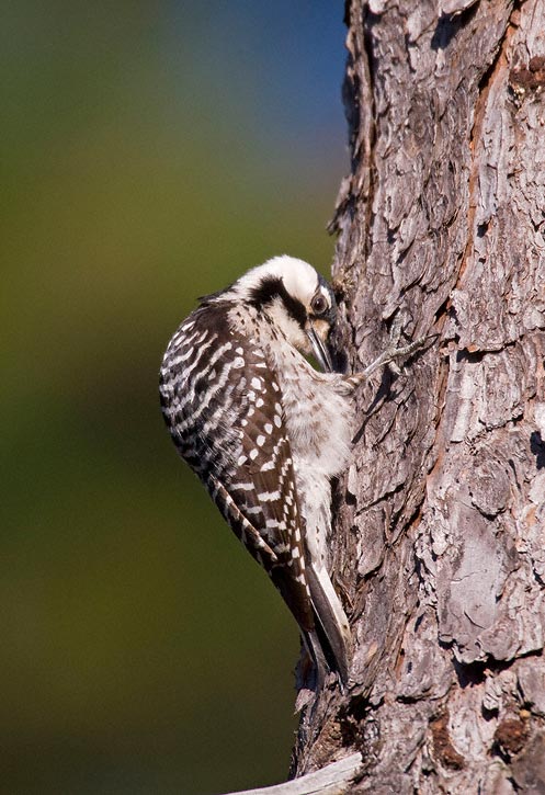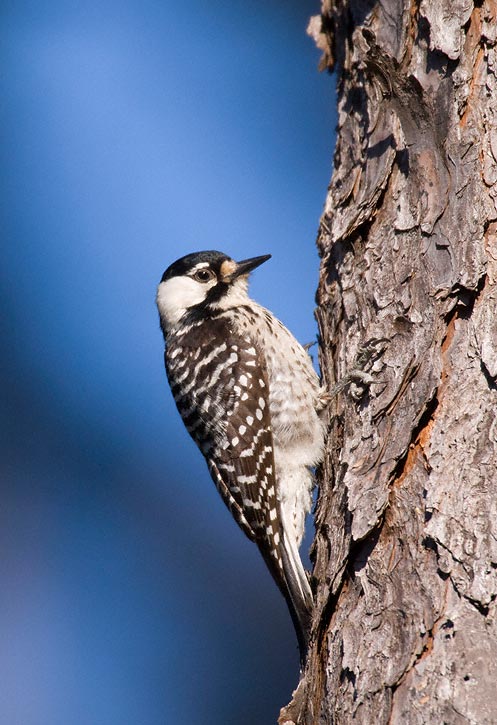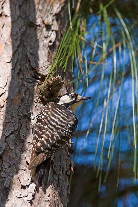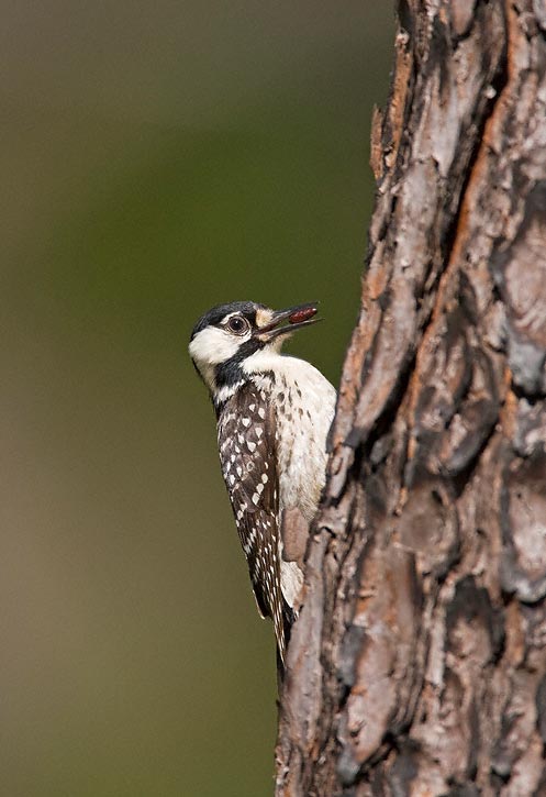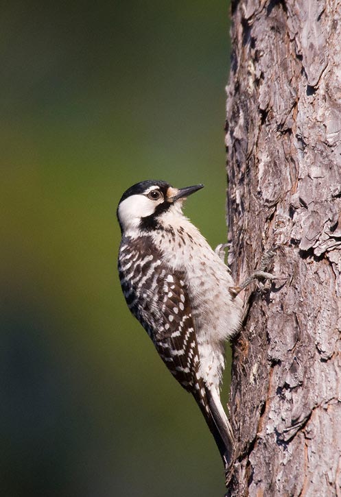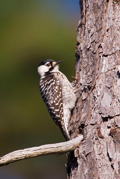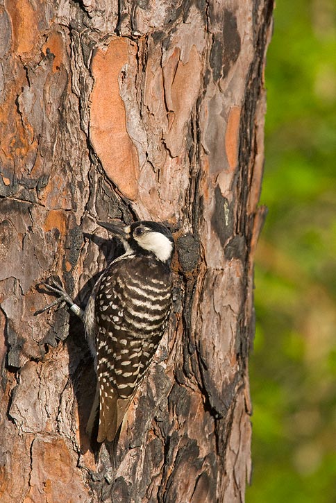 | The next 11 images of Red-cockaded Woodpecker were taken in the Angelina National Forest in Jasper Co., Texas, in March, 2008, with a Canon EOS 1D Mark III and EF 600mm F/4 L IS lens and 2X extender. There are a couple of shots of the bird preening and one of it foraging under a piece of pine bark. I was standing near a nest tree while an adult was investigating the man-made nest cavity. An un-banded bird worked its way down a pine tree near me and I was able to get some very nice images, certainly the best I have ever taken of this species, which can be very difficult to photograph. I felt very lucky indeed to have had this experience. |
