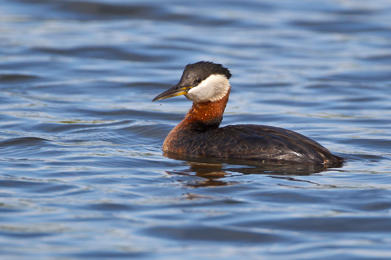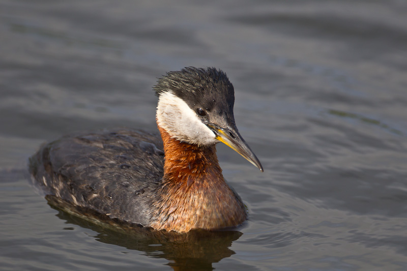 | The Red-necked Grebe (Podiceps grisegena) is a species of the northern United States, Canada and Alaska, where it may be found on lakes and rivers. The species may wander south of its breeding range during the winter and has occurred at many locations in the southern U.S. The first five images on this page show a breeding plumaged bird in Anchorage, Alaska, in June, 2012. These shots were taken with a Canon EOS 1D Mark IV and an EF 500mm F/4 L IS lens and 1.4X extender. | ![]() |