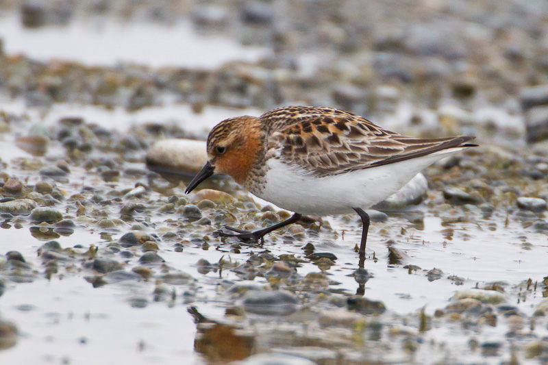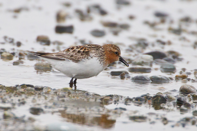 | The Red-necked Stint (Calidris ruficollis) is an old world species which occurs rarely in western Alaska. It has wandered casually to the lower 48 states, but is usually encountered only in Alaska. The shots here show a breeding plumaged bird at Gambell, St. Lawrence Island, Alaska, in May, 2012. The bird was at this location for about an hour then was not seen again to my knowledge. | ![]() |