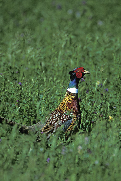 | The Ring-necked Pheasant (Phasianus colchicus) is a bird which was introduced to North America as a game bird. It is native to China. It has become established in much of the United States and portions of southern Canada. The two shots of the adult male here were taken in Phillips Co., Montana, in June, 2001, with a canon EOS 3 and EF 500mm F/4 L IS lens on Fuji Velvia. One image shows the bird hiding in the grass. The shot at right, with the three baby pheasants on some brush, was taken at Bear River N.W.R., Box Elder Co., Utah, in June, 2001, with the same equipment as above. | ![]() |