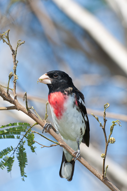 | The Rose-breasted Grosbeak (Pheucticus ludovicianus) is a fairly common nesting species of the northeastern and north central United States as well as parts of central Canada. The species winters in southern Mexico as well as much of Central America and northern South America. The adult male in the first three images shown here was a spring migrant at South Padre Island, Cameron Co., Texas, in April, 2009. These shots were taken with a Canon EOS 1D Mark III and an EF 800mm F/5.6 L IS lens. | ![]() |