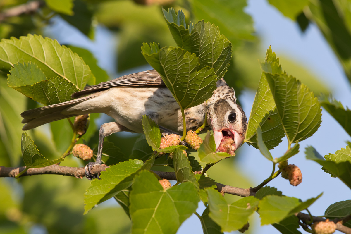 | Rose-breasted Grosbeak Pheucticus ludovicianus female - feeding on mulberries High Island, Galveston Co., Texas 24 April 2018 |