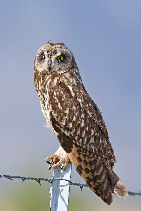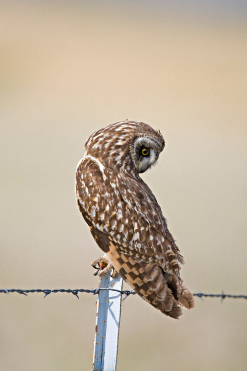 | The next 19 images of Short-eared Owl were taken at Bear River N.W.R., in June, 2007. As I drove along a county road bordering the refuge late one afternoon, I saw a Short-eared Owl perched on a metal fence T-post along the roadside. Over many years I have had this happen many times, and I fully expected the bird to fly away as soon as I stopped my vehicle, but I stopped anyway, just on the off chance the bird would stay put. Well, the bird sat still and allowed me to take many images as it sat on the fence, watching the grass for prey as well as paying attention to a couple of Eastern Kingbirds which were harassing it. I was able to get a number of shots with a 600mm F/4 L IS lens and a Canon EOS 1D Mark III body before the bird departed. |