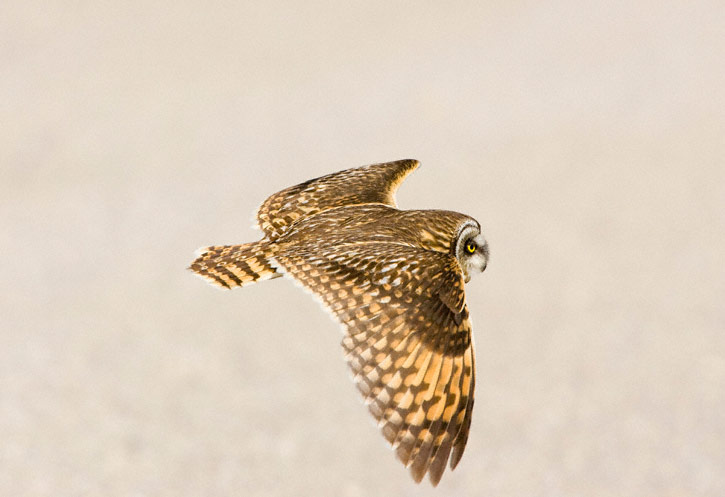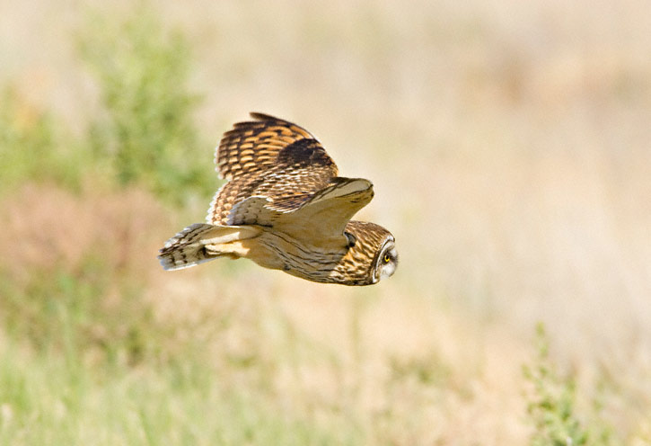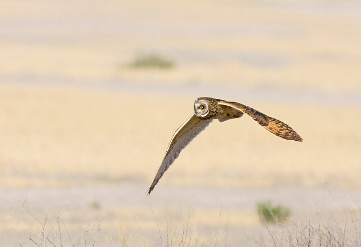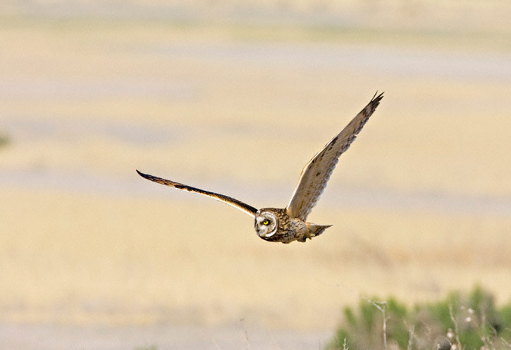 | A day after the above images were taken I found another Short-eared Owl in a different area of Bear River N.W.R. This bird began to forage by flying back and forth along a brushy ditch trying to flush out a rodent or other prey and I was able to get a few flight shots. These images were taken with a Canon EOS 1D Mark II and EF 500mm F/4 L IS lens and 1.4X extender. |