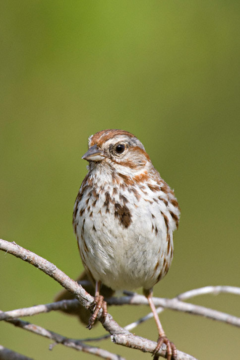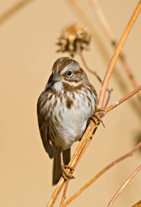 | The Song Sparrow (Melospiza melodia) is a breeding species of most of the northern two-thirds of the United States and most of Canada. The bird winters in the southern two-thirds of the U.S. The first two shots here show a wintering Song Sparrow at Bosque del Apache N.W.R., Socorro Co., New Mexico, in November, 2005. These digital images were taken with a Canon EOS 1D Mark II and EF 600mm F/4 L IS lens and 2X extender. | ![]() |