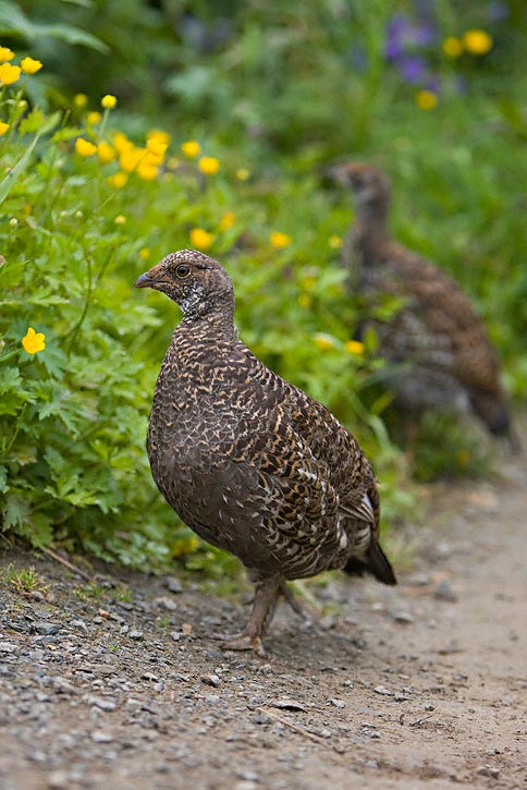 | The female and young Sooty Grouse in the next 13 shots were on Mt. Roberts, Juneau, Alaska, in August 2008. These images were taken with an EOS 40D and EF 70-200 mm F/4 L IS lens. The female shown here is feeding on vegetation. In the next image a young bird has joined the female. |