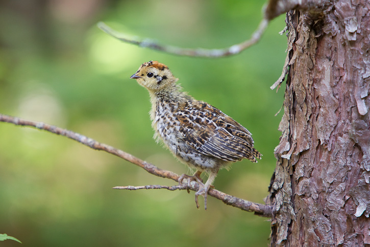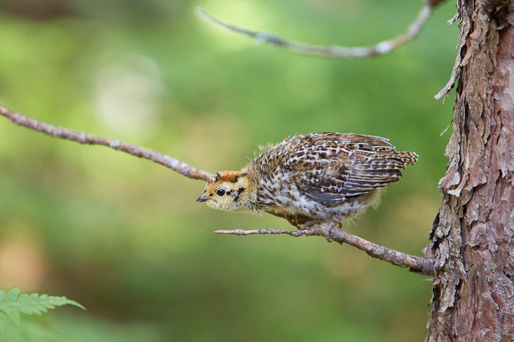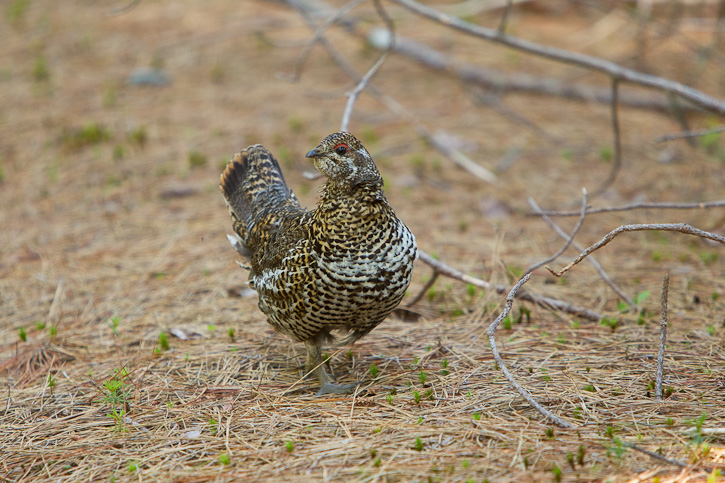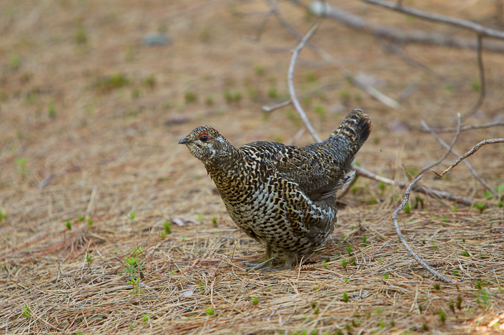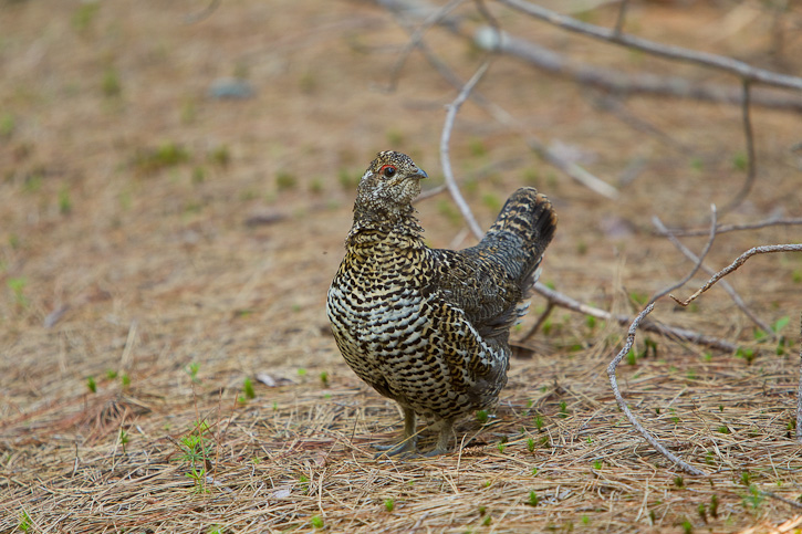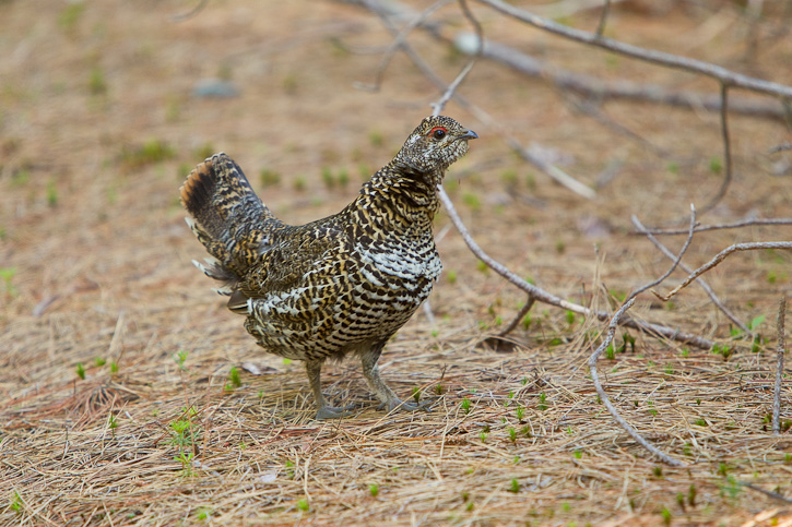 | The next series of 11 images of Spruce Grouse were taken near the Machias River, Washington Co., Maine, in June. 2010, with a Canon EOS 1D Mark III and an EF 70-200 F/2.8 L IS lens and a 1.4X extender. We were driving along a small dirt road in the forest late in the afternoon when we saw a female Spruce Grouse cross the road right in front of our vehicle. We were able to stop before hitting the bird and proceeded to take some shots. The female went back across the road from where she had come and we saw several small chicks in the roadside vegetation. Eventually the female and the chicks vanished into the forest. |