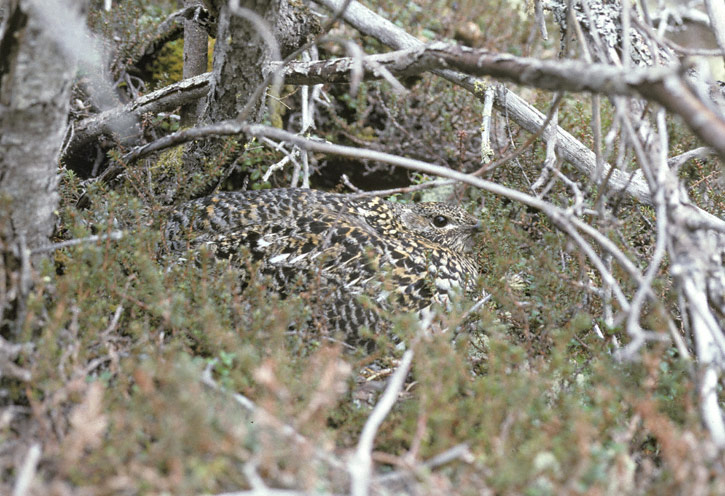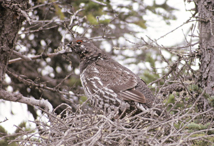 | The Spruce Grouse (Falcipennis canadensis) is truly a bird of the far north in the Americas. The species may be found in a few locations on the northern edge of the U.S. border from Maine to Washington state, but most of the bird's range is in Canada and Alaska. The first two shots shown here were taken in Churchill, Manitoba, during June, 1988. The first shot shows a male while the next shot shows a female on a nest. The third shot, of a female Spruce Grouse, was taken in the mountains above Loomis, Okanogon Co., Washington, in June, 1998. |