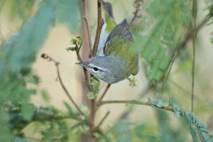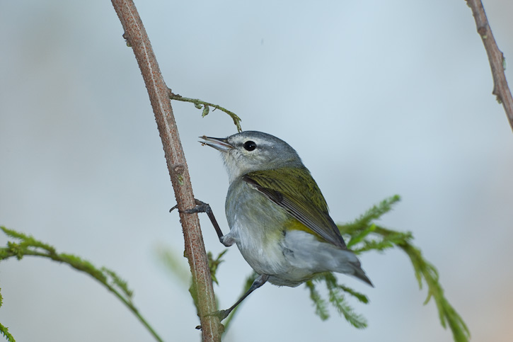 | The Tennessee Warbler (Vermivora peregrina) is a species which nests mainly in the boreal forests of Canada. They winter in Central America, the Caribbean as well as northern South America. The first 3 shots on this page show a spring migrant Tennessee Warbler at South Padre Island, Cameron Co., Texas, in April, 2009. These 3 shots were taken with a Canon EOS 1D Mark III and EF 800mm F/5.6 L IS lens. | ![]() |