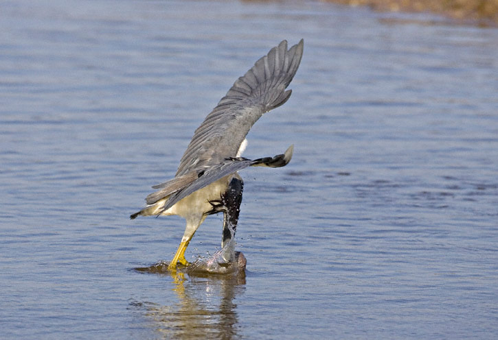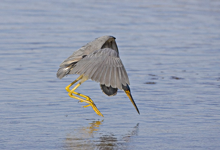 | The four images shown here were taken at Ding Darling N.W.R., on Sanibel Island, Lee Co., Florida, in November, 2006. Several herons and egrets had discovered a number of fish in a deep pool of water. The water was just too deep for the egrets to wade in and hunt the fish as they usually do, so the birds improvised. I watched as several species, including this Tricolored Heron, flew back and forth over the pool and plunged their head and bill into the water in order to catch a fish without sinking too deep in the water! It was fun to watch. These shots were taken with a Canon EOS 1D Mark II and EF 500mm F/4 L IS lens. | ![]() |