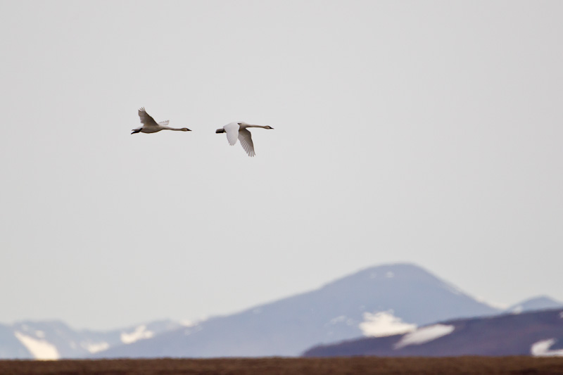 | The Tundra Swan (Cygnus columbianus) breeds in tundra habitat across the high arctic and winters in the western United States in large numbers. The two shots on this page show Tundra Swans at Nome, Alaska, in May, 2012. | ![]() |