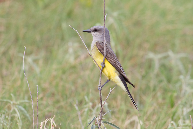 | The next three images show a Western Kingbird working a weedy field in Austin, Travis Co., Texas, in June, 2011. The bird caught a large grasshopper just after these shots were taken and flew to a nearby power line to eat its meal. These three shots were taken with a Canon EOS 1D Mark IV and a Sigma 50-500 lens. | ![]() |