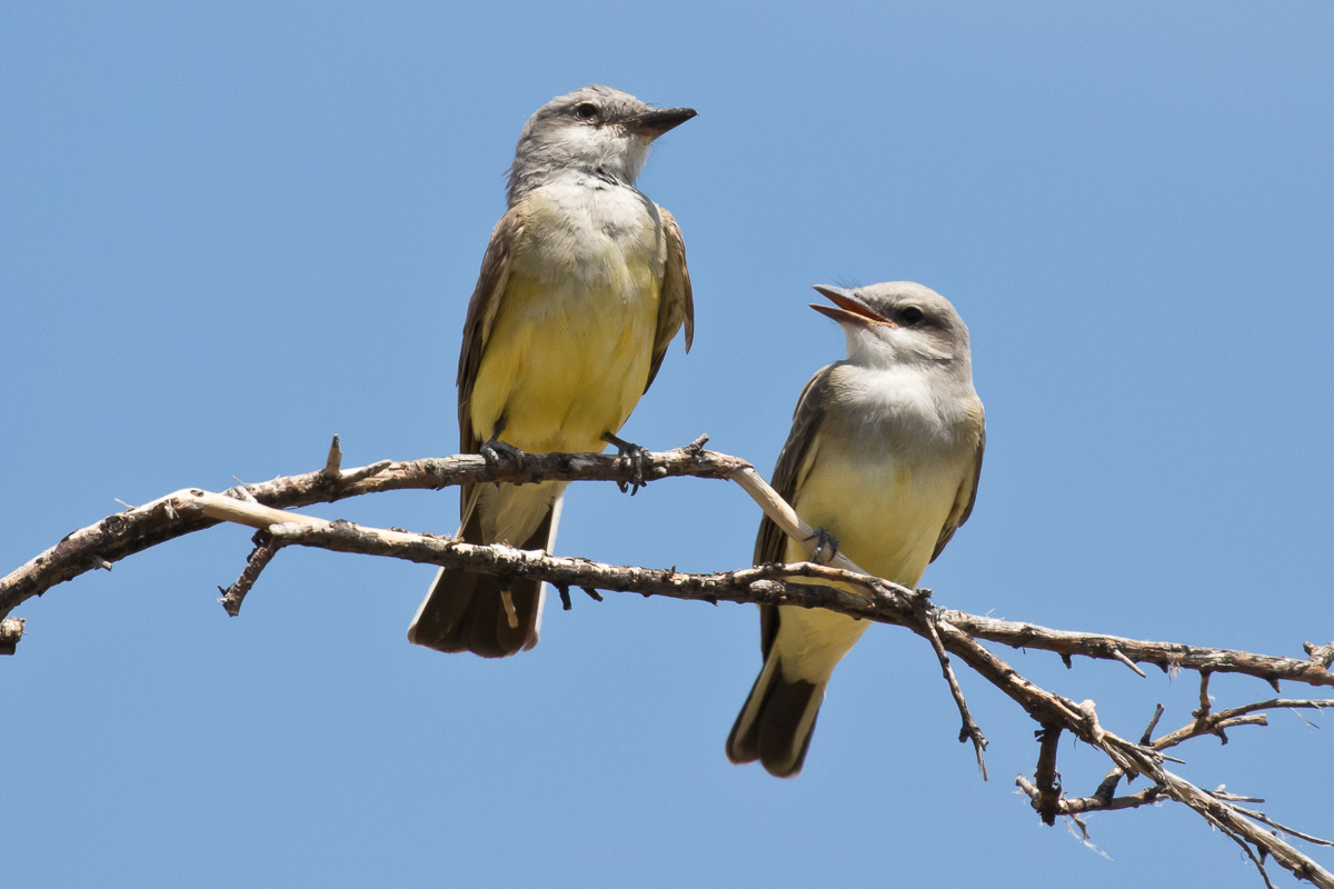 | Western Kingbird Tyrannus verticalis adult on the left, juvenile on right Mesa Rest area on U.S. 285, N of Roswell, Chaves Co., New Mexico 16 August 2015 |