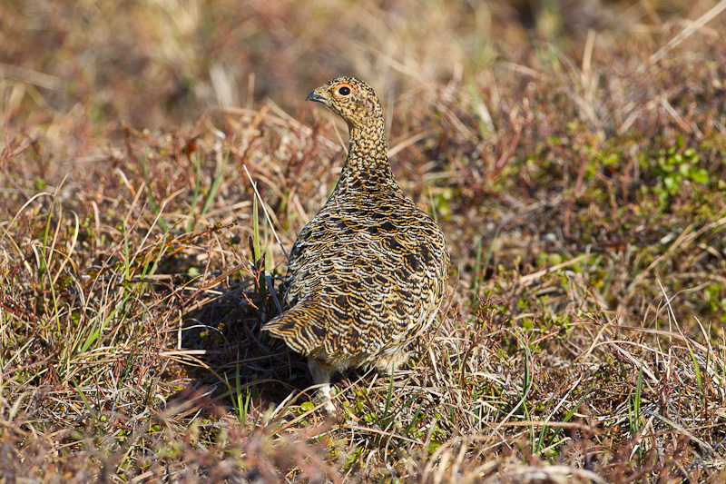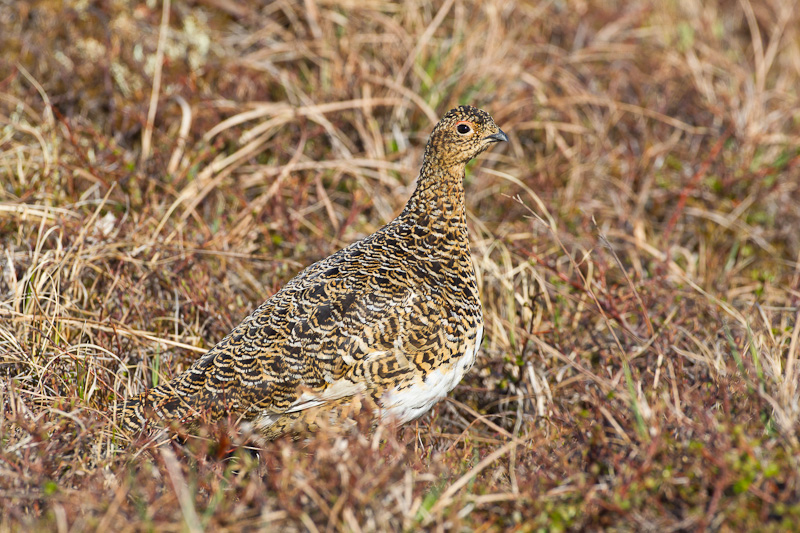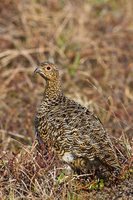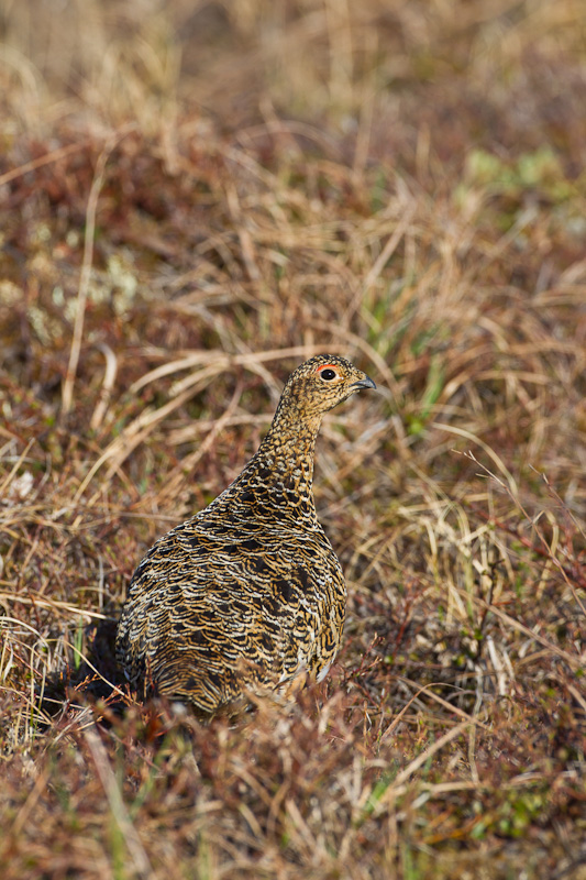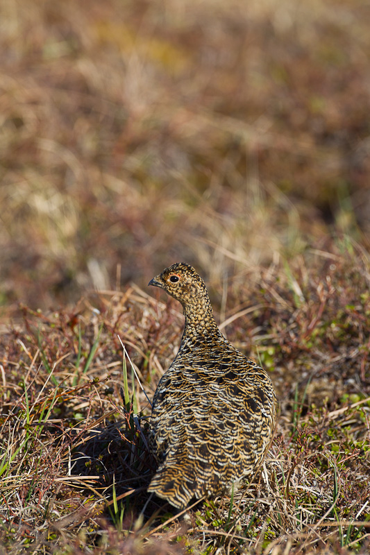 | The next five shots show a female Willow Ptarmigan at Nome, Alaska, in June, 2012. These shots were taken with a Canon EOS 1D Mark IV and an EF 500mm F/4 L IS lens. The protective coloration of this bird is remarkable. When the bird stood motionless it almost disappeared! |