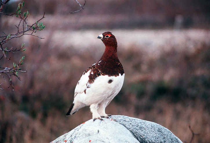 | The next three shots show a breeding plumaged Willow Ptarmigan in Churchill, Manitoba, in June, 1988. The same gear as the first image n this page was used. |