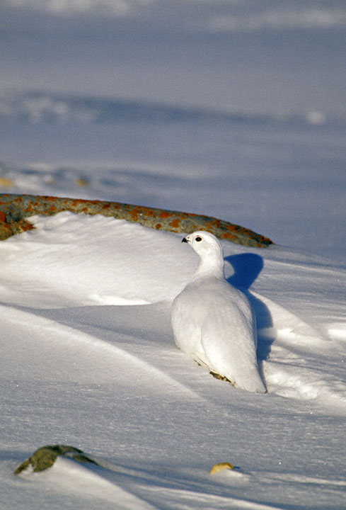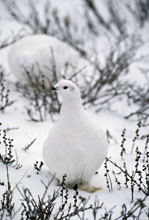 | The next two photos shown here of a winter plumaged Willow Ptarmigan were taken in November, 2002, at Churchill, Manitoba, with a Canon EOS 1V and EF 500mm F/4 IS lens on Ektachrome VS 100 film. |