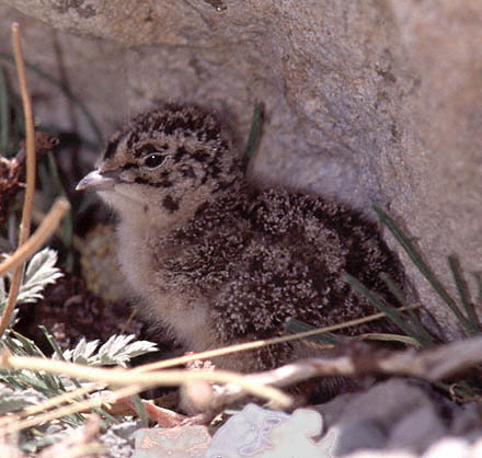 | The Gray-breasted Seedsnipe (Thinocorus orbignyianus) occurs in the Andes of Peru and into Argentina and Chile. The photos presented here are of a one-day old chick (from a clutch of four) near El Yeso Reservoir, Chile. The adult was nearby. The photos were taken on 13 January 1999 with a Canon EOS 1N & EF 300mm F4L IS lens with fill flash mounted on a gunstock. The film was Fuji Sensia 100. The four chicks were hiding under rocks and brush at the edge of a dirt road. I suspect there are very few photos of this species at this age. | ![]() |