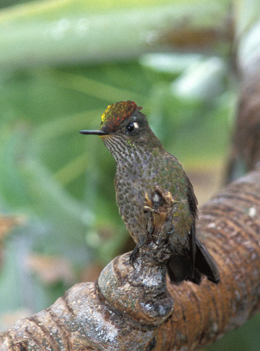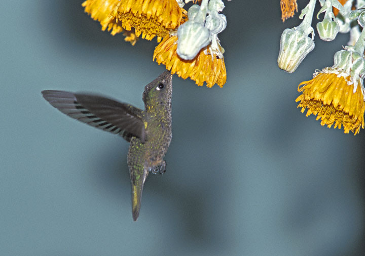 | The Green-backed Firecrown (Sephanoides sephanoides) occurs in western Argentina and Chile. It can be fairly common in some locations, especially the island of Isla Robinson Crusoe, 350 miles off the Chilean coast. Go to the page about the Juan Fernandez Firecrown for more information about this island and its endemic hummingbird. The photos on this page were taken on Isla Robinson Crusoe in February 2000 with a Canon EOS 3 and an EF 300mm F4 IS lens and flash on Fuji Velvia pushed one stop. | ![]() |