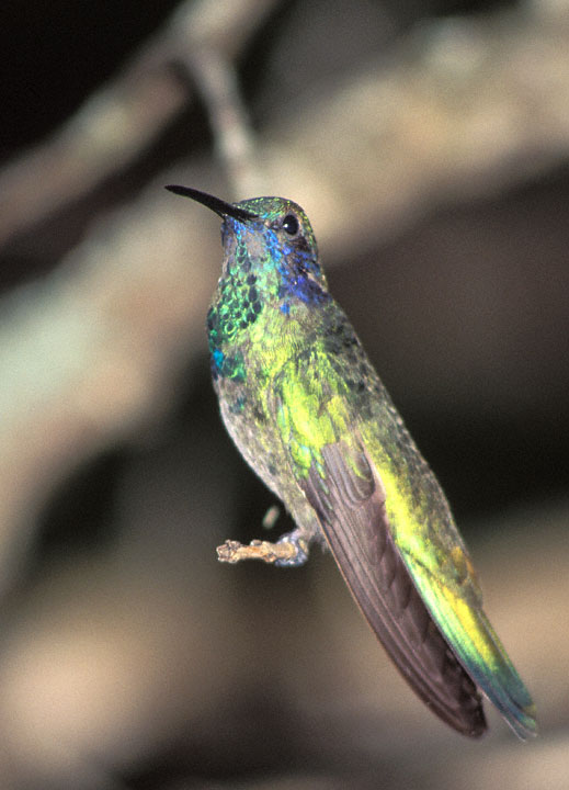 | The Green Violet-ear (Colibri thalassinus) occurs throughout a large area of the highlands of Mexico, Central America, and South America. In July, 1961, a Green Violet-ear was found in South Texas. Since that time there have been more than 40 additional accepted records of this species in Texas as well as a number of other records from locations such as Louisiana, Arkansas, North Carolina, and even Canada! The species certainly is prone to wander, especially in mid and late summer when most of the extralimital records occur. The three photos shown at the top of the page were taken in June, 1995, at Sandy Creek, Travis Co., Texas where the bird visited a feeder for a number of days. The photos were taken with a Canon T-90 and Sigma 500mm F4.5 lens and 1.4X extender and Fresnel flash on Fuji Sensia 100. This bird is not as brightly plumaged as some, probably because it is not a full adult. See below for images from elsewhere. |
