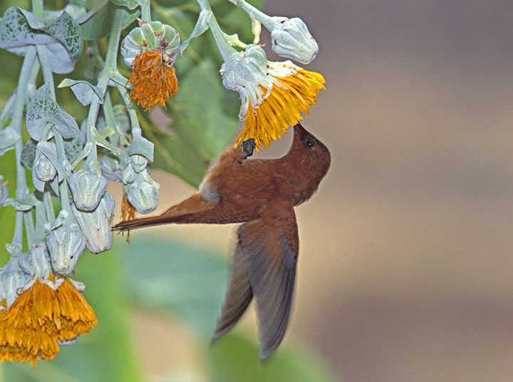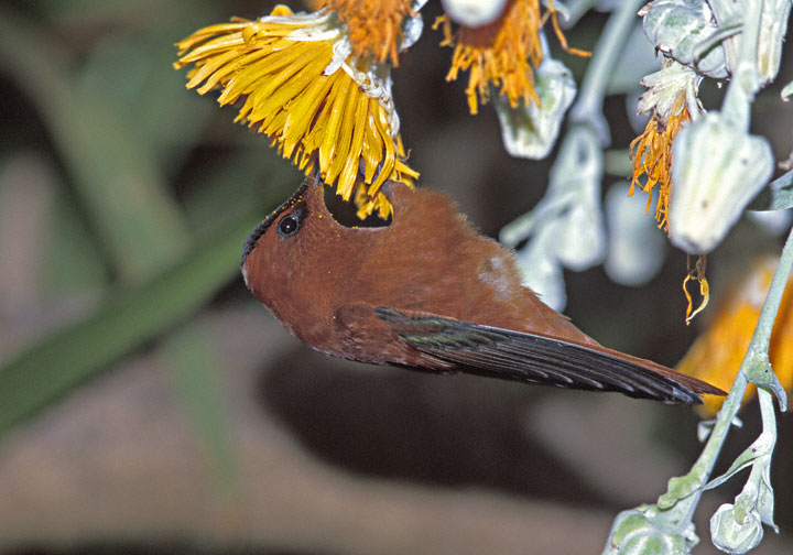 | Juan Fernandez Firecrown (Sephanoides fernandensis) About 350 miles west of the coast of Chile there is a small group of Islands called the Juan Fernandez Islands. One of these islands is about 40 square miles of rugged, rocky landscape and is known as Isla Robinson Crusoe. It was on this island where Alexander Selkirk was marooned in the early 1700s. His story was later the basis for the novel "Robinson Crusoe" by Daniel Defoe. Just getting to the island is quite an accomplishment and perhaps I will add a story about that at a later time. For the ornithologist, one of the most interesting things about Isla Robinson Crusoe is its endemic and endangered hummingbird, the Juan Fernandez Firecrown. This spectacular hummingbird occurs no where else on earth. It is a large hummingbird, about five inches long and is thought to number only about 500 individuals. The bird can be fairly common in the only town on the island, San Juan Bautista where it feeds on native and introduced flowering plants. This is one of the most attractive hummingbirds I've ever seen; the male is brick red with green wings and a crown that glows emerald green to ruby red depending upon the angle of the light. I visited this island for three days in February, 2000, with my friend Victor Emanuel. The photos on this page were taken with a Canon EOS 3 and an EF 300mm F4 IS lens and flash on Fuji Velvia pushed one stop. See below for more photos of this species and click here for shots of the Green-backed Firecrown which also occurs on this island. |