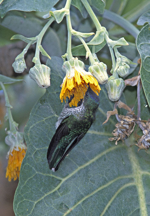 | The Juan Fernandez Firecrown has huge feet for a hummingbird, and certainly puts those feet to good use! Almost like a an Olympic athlete working on hanging rings, the bird often grips the petals of a flower with its feet and hangs there to feed. Sometimes, as if showing off its agility, a bird will dangle by one foot like the individual at right. The green crown seen on a shot at right shown here, can also look brilliant red, depending upon the angle of the light. |