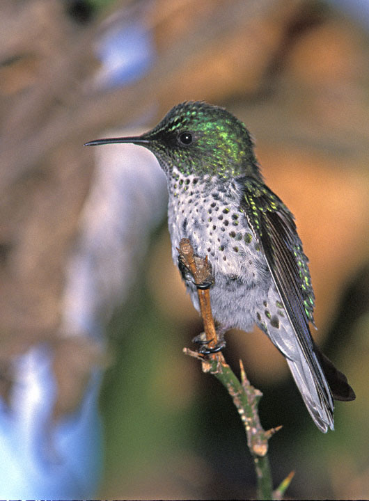 | The female Juan Fernandez Firecrown is green and white with white outer tail feathers. For many years this was thought to be a different species, but finally people started seeing the red colored birds paired up with the green birds and the mystery was solved. |