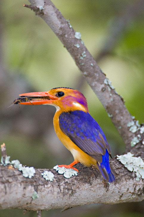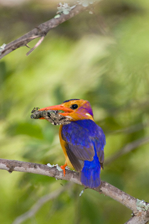 | The African Pygmy-Kingfisher (Ispidina picta) is a gorgeous little kingfisher that is always a delight to see. In January, 2006, several of us spotted a pair of these beautiful birds feeding young in a nest burrow along the banks of the Olifantspruit River in Limpopo Province, South Africa. Before each trip to the nest burrow we saw that the adults would pause for several seconds on a nearby branch to survey the surroundings. We parked our vehicle near this limb hoping the birds would continue to pause at that spot and we were rewarded with some nice shots. The pair was seen bringing in several frogs, lizards, grasshoppers, dragonflies, and moths. Quite a busy set of parents for sure! The photos shown here were all taken with a Canon EOS 1D Mark II & EF 500mm F/4L IS lens and a 1.4X or 2X extender. | ![]() |