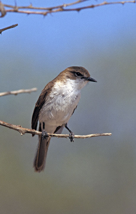 | The Marico Flycatcher (Bradornis mariquensis) is a small, very plain brown and white flycatcher of southern Africa. It is often quite conspicuous and perches in open locations such as fences and bare limbs. The shots here were taken in October, 1998, in Etosha National Park, Namibia, with a Canon EOS 1N and EF 300mm F/2.8 L lens and 2X extender on Fuji Sensia. | ![]() |