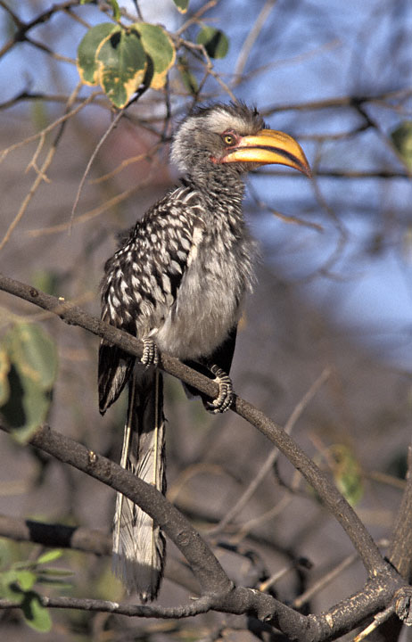 | The Southern Yellow-billed Hornbill (Tockus leucomelas) is a common resident in southern Africa. They are commonly seen in scrub and dry woodland areas. The shot of the single bird on the right and the group together on a bush in the next image were photographed with a Canon EOS 1N & EF 300 mm F2.8L lens and a 2X extender in Namibia in 1998. Normally, I do not generally like bird photos that are back lit, but the one of the birds on the bush with their yellow bills highlighted worked out Okay. | ![]() |