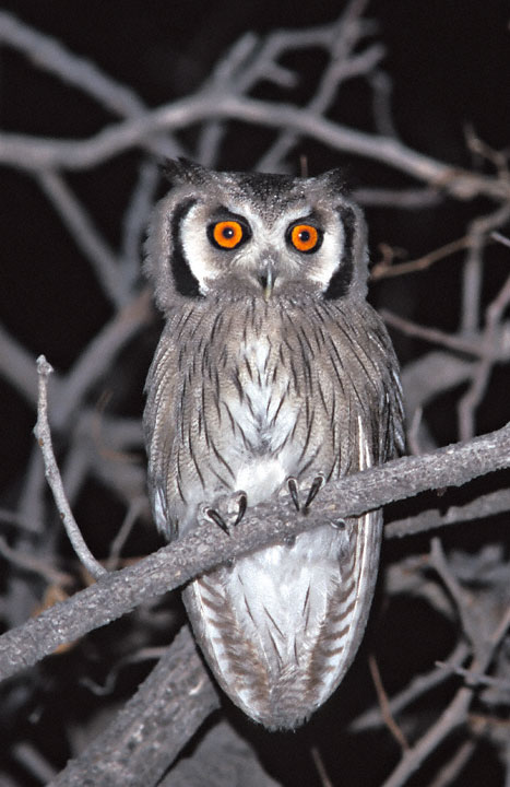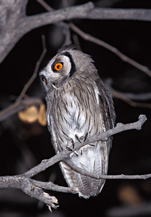 | The White-faced Scops-Owl (Otus leucotis), also simply called White-faced Owl by some authors, is widespread across the savannas of Africa. It often nests in abandoned stick nests of small hawks, but will also use a nest hole in a tree as well. The first individual was photographed in Halali Camp, Etosha National Park, Namibia, in October, 1998. This bird was giving a rarely heard cat-like cry when photographed. The photos were taken with a Canon EOS 1N & EF 300mm F4L IS lens with a 1.4X extender and a 540 EZ flash on a Really Right Stuff flash bracket. The film was Fuji Sensia 100. The flash bracket elevated the flash high enough to avoid "red eye" which is often a problem when photographing owls. The camera and lens were hand-held on a BushHawk shoulder mount. The next shot shows another White-faced Owl at a day roost, also in Etosha National Park a few days later. | ![]() |